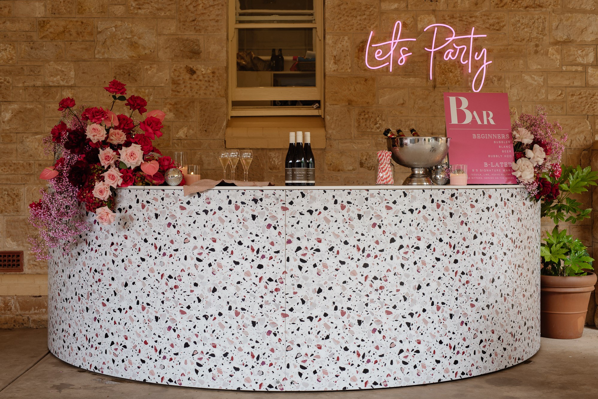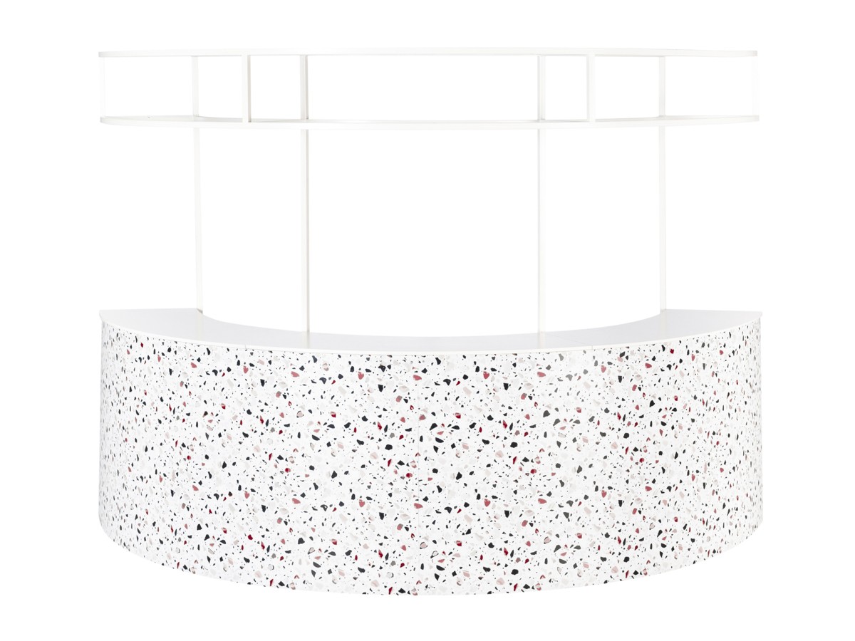 Stylish, modern, and designed to impress—our Terrazzo Circular Bar is the ultimate statement piece for any event. Featuring a chic terrazzo print front and functional interior shelving for seamless service, this half-circle bar is both eye-catching and efficient. Add our matching canopy to create height and structure, perfect for hanging florals, lighting, or signage. Ideal for weddings, large-scale celebrations, and events that demand a standout focal point.