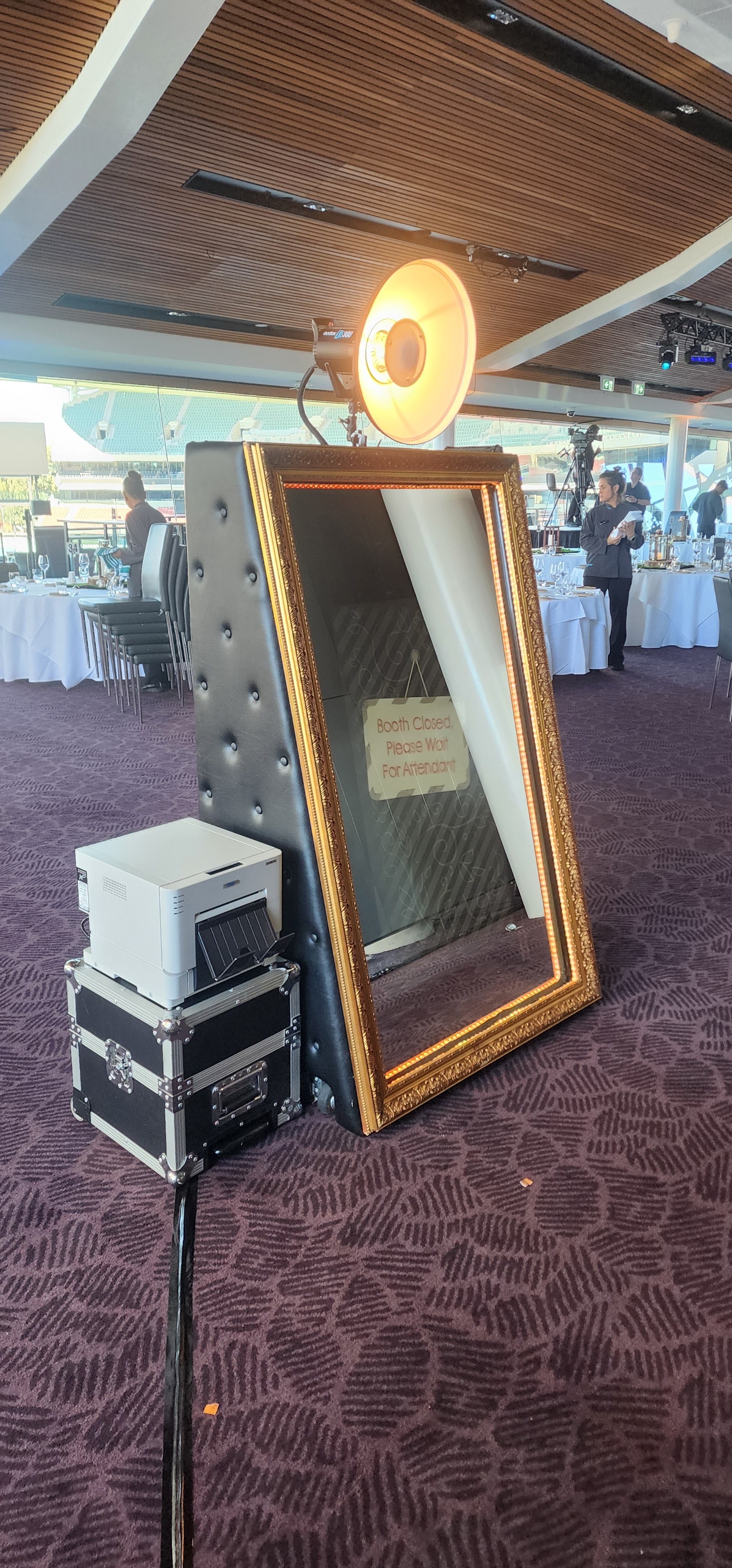 A "magic mirror" experience with a customizable booth in black or white, featuring options for a gloss black, gloss white, rustic gold.